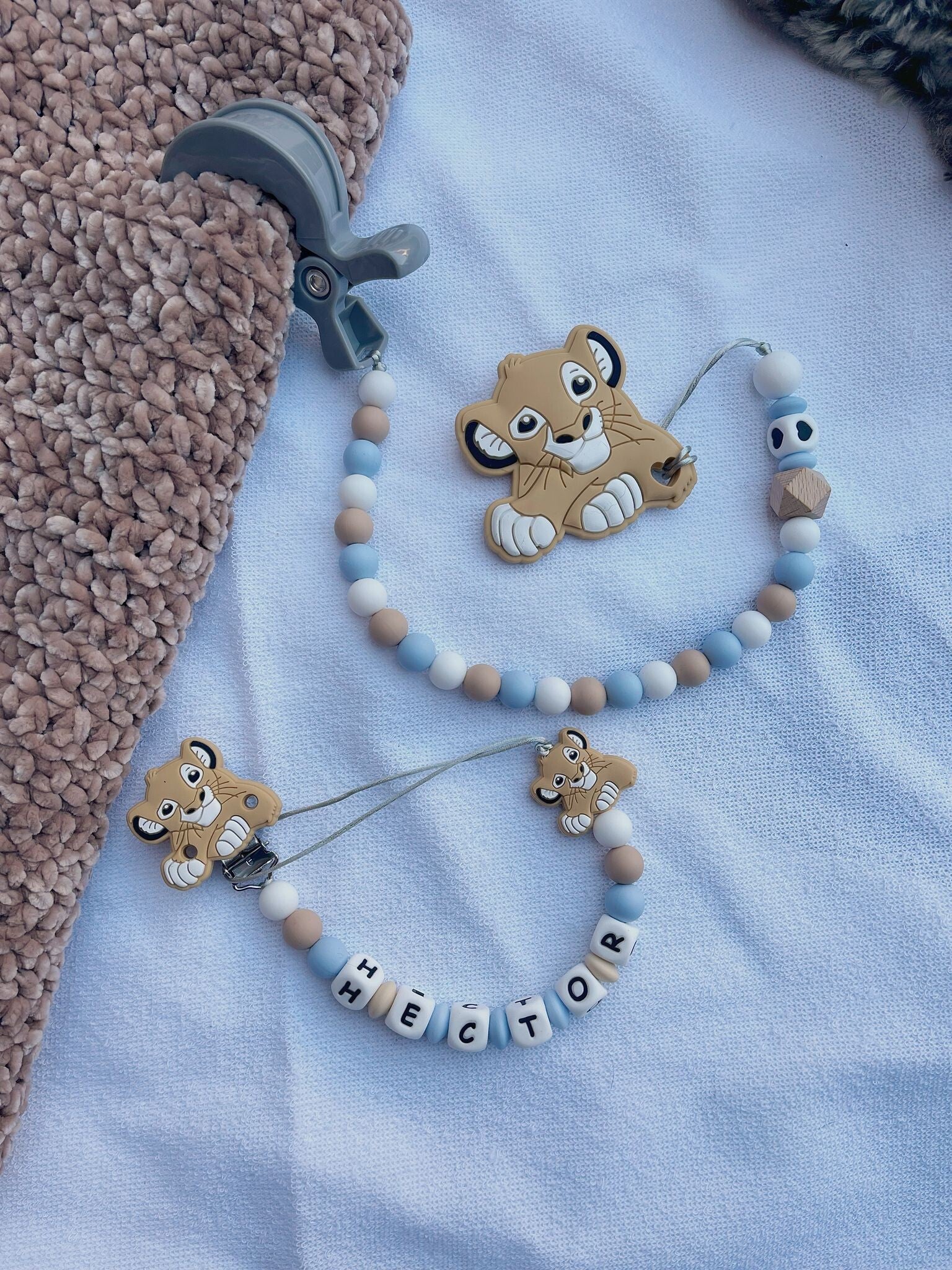 - Chupetero Simba: Personalizado con el nombre de tu bebé, perfecto para que siempre tenga el chupete a mano mientras recorre su reino.
