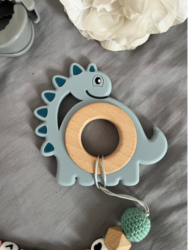 El accesorio perfecto para tu peque. Nuestro mordedor de dinosaurio, personalizado con su nombre, es ideal para calmar sus encías mientras se divierte. Además, con la pinza para el carro, no se caerá ni se perderá.
