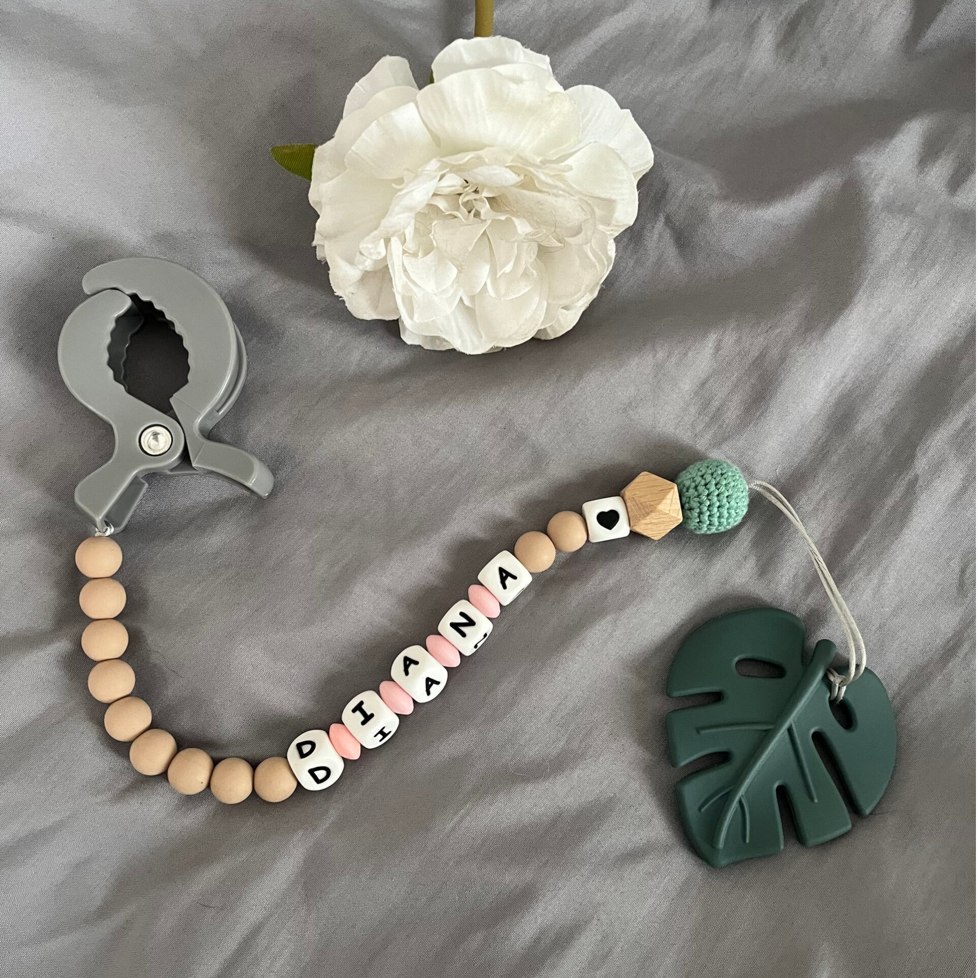 🍃 Mordedor Hoja Verde + Pinza para el Carro con el Nombre de tu Bebé 🌱