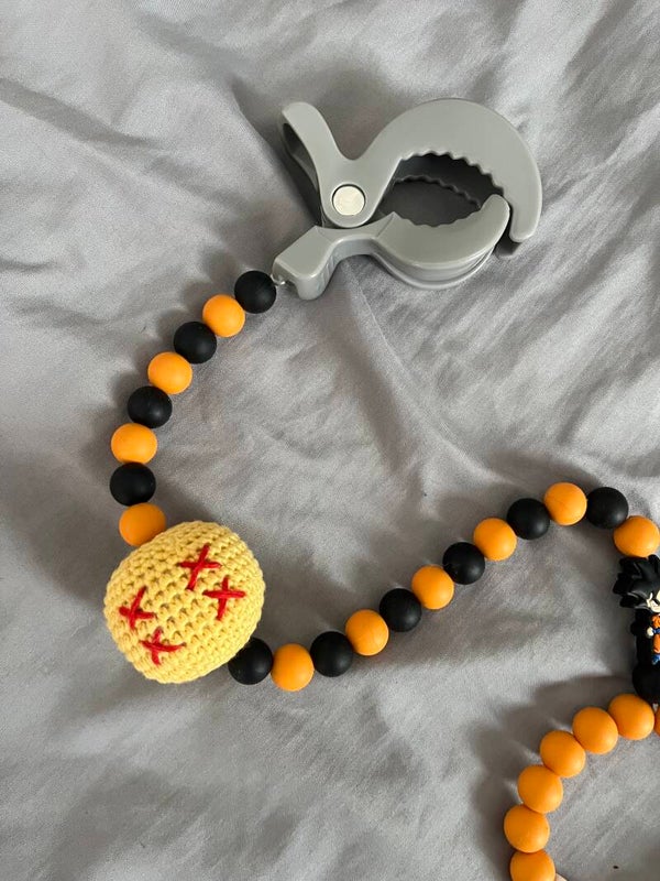 El accesorio perfecto para los pequeños fans de Dragon Ball. Nuestro mordedor de Son Goku, personalizado con su nombre, es ideal para calmar sus encías mientras se divierte. Y con la pinza para el carro, nunca se caerá ni se perderá.